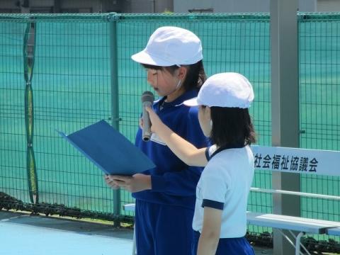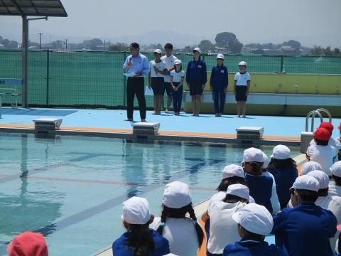 業間の時間にプール開きが行われました。全身運動でもある水泳の学習がいよいよ始まります。全校生で安全に活動できるようにお願いし、児童を代表して6年の森田さんが今年の目標を発表してくれました。校長先生や岡先生から心構えや注意事項を聞き、全員が積極的に活動する事をちかいました。