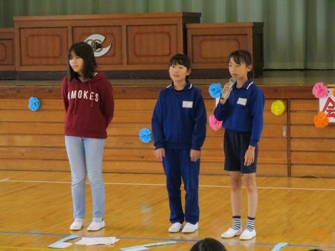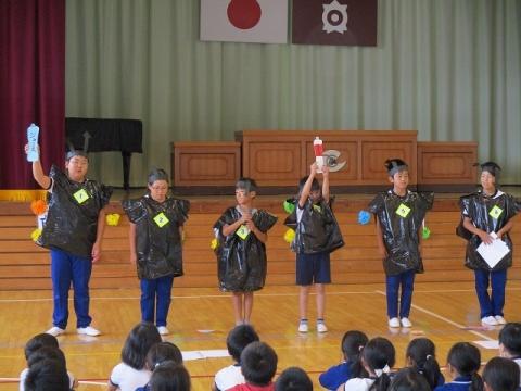 健康委員会が歯っぴー集会を開きました。始めによい歯の児童(虫歯・歯垢がなく、歯磨き状態のよい児童)27名が紹介されました。その後、健康委員会による「歯の保健劇」が行われ、歯磨きの大切さを全校児童に発表しました。