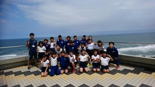臨海自然教室も中間点。お日様が顔を出してくれました。太平洋をバックに、全員元気です。