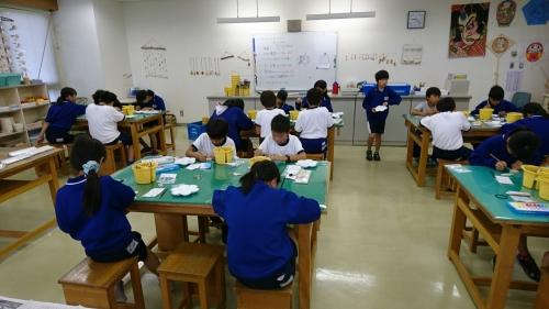 臨海自然教室の最終日。外は、あいにくの雨ですが、計画どおり「マンボウキーホルダー作り」に取り組んでいます。