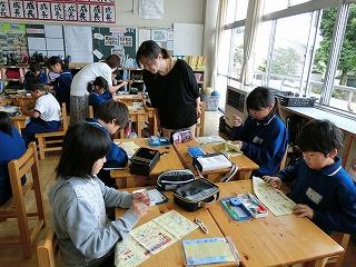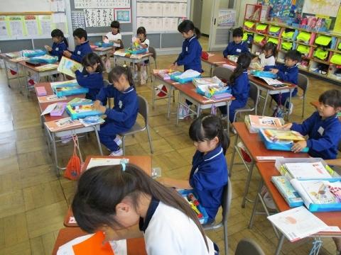 道徳の時間「おかたづけをしよう」の学習をしました。いろいろ考えた後、自分のお道具箱の整理をしました。消しゴムのカスや、折り紙の切れ端などを片づけて、きれいに整理されました。