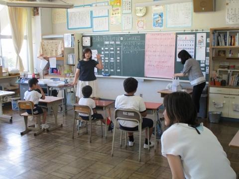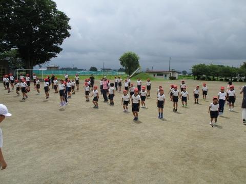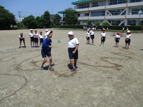 紅白に分かれて、ラジオ体操の練習をしました。集合すること、体操の隊形に開くこと等、集団行動の一つです。体育委員のみなさんが、全校生の前でお手本になりました。