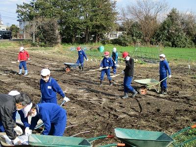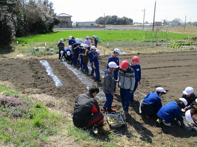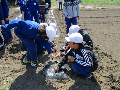 5年生が学校農園「グングンファーム」にじゃがいもの種芋を植え付けました。先日、農園活動のボランティアとして武田さんに畑を耕していただいたのでスムーズに活動できました。