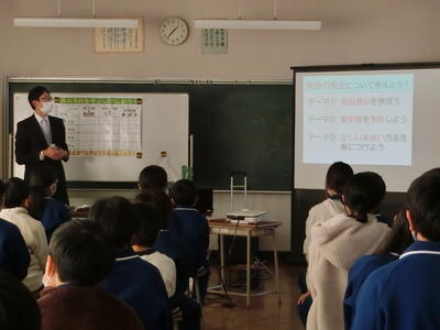 講師の方をお迎えし、食品安全教室をを実施しました。水で手を洗った後と、ハンドソープで手を洗った後の汚れの落ち方の実験をしたり、食中毒や食品表示の話を聞いたりしました。