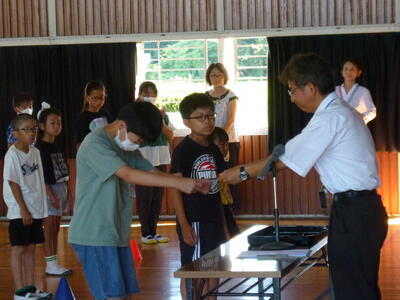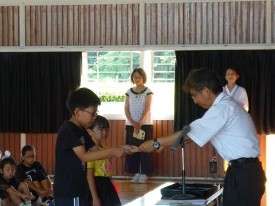終業式では、校長より「自分で目標を決め、計画的に過ごすこと」「交通事故や水の事故には十分気を付けて過ごすこと」等の話をしました。