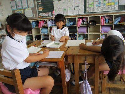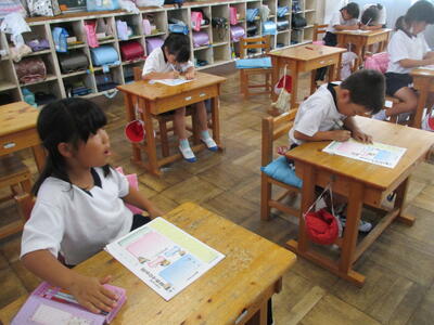 各学級で学級活動の時間を使って、1学期の振り返りをして、友達の良さや大切さについて話し合いました。そして、友達への感謝の気持ちを「ありがとうカード」に書きました。