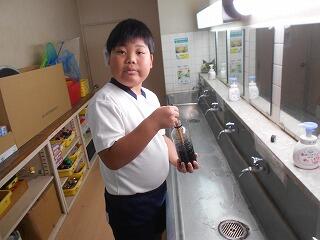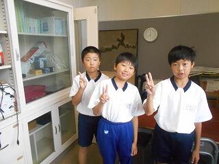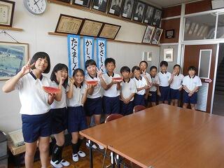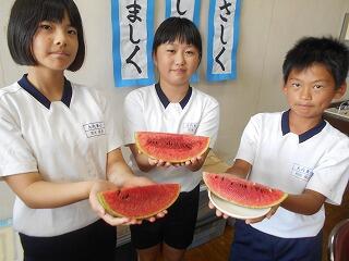5年生と6年生が、教材園で育てていた「すいか」を持って来てくれました。とても美味しくいただきました!(写真は、5年生が校長室に「すいか」を持って来てくれたときの様子です。)