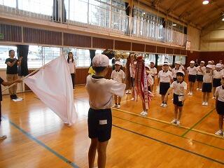 今日は雨が降っているので、体育館での全体練習となりました。練習の内容を変更し、2校時は、開閉会式の練習を行いました。