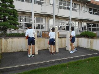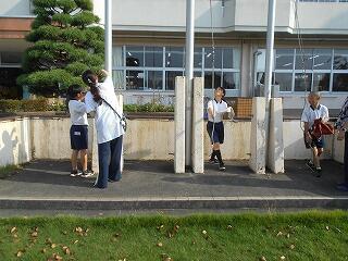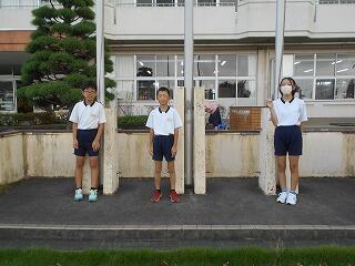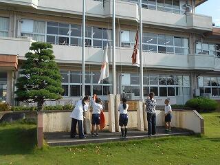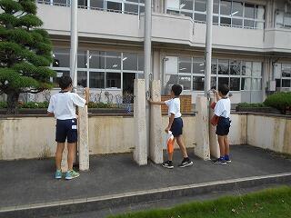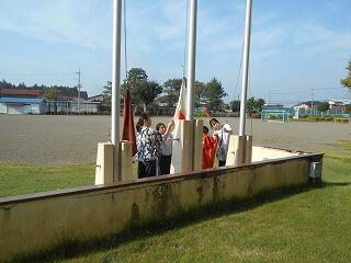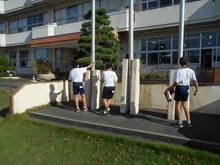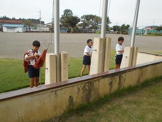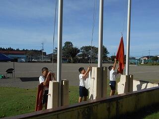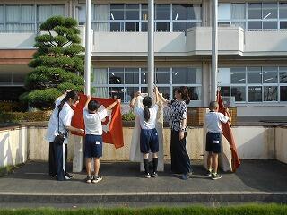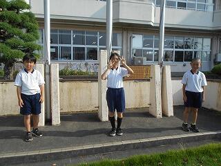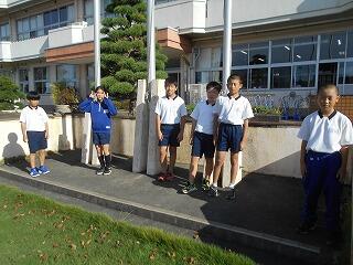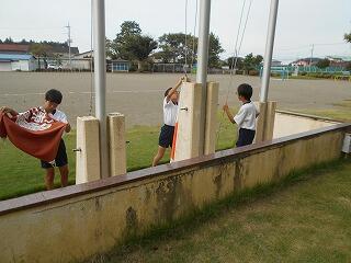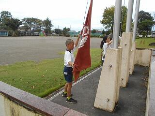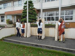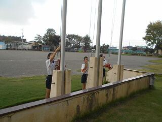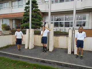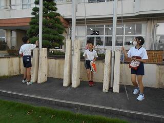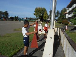 今日は、運動会の旗係の練習として、5年生が朝の旗揚げを行っていました。国旗の上下や表裏、揚げ方や固定の仕方など、経験を積んで少し成長できました!