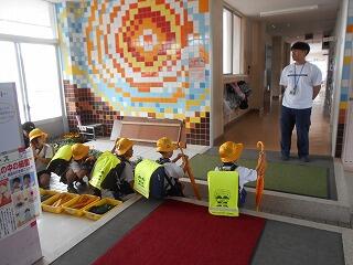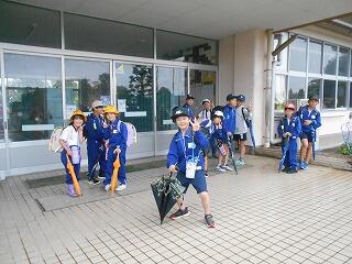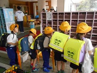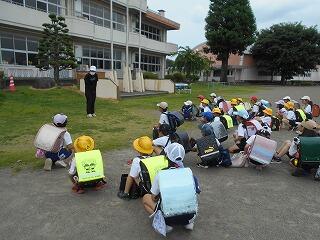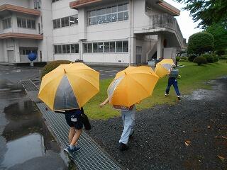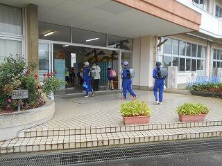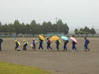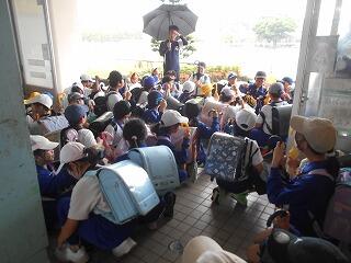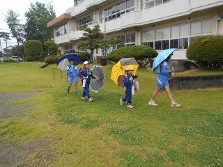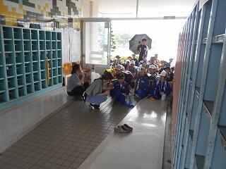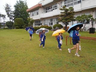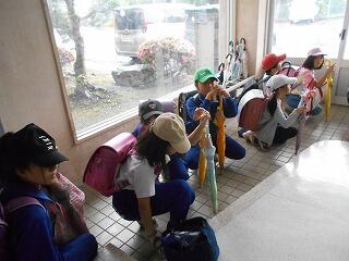 今日は水曜日なので、全学年での下校です。雨が降っているので、昇降口で下校指導を行いました。