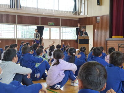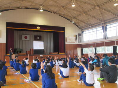 116年を迎える、歴史と伝統のある大内東小学校について、全校生でお祝いしました。