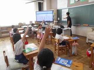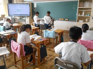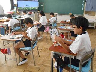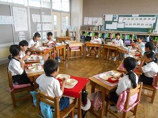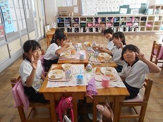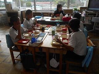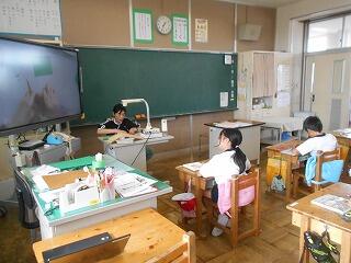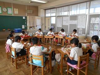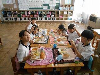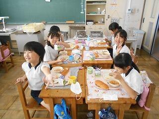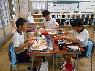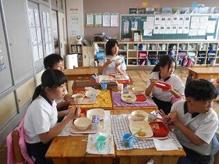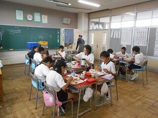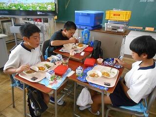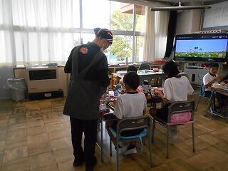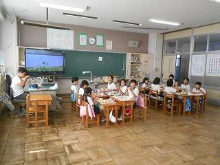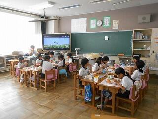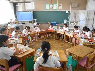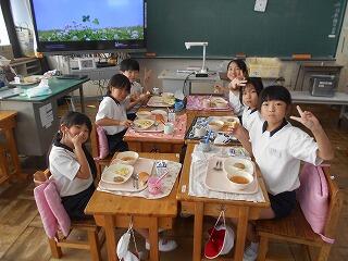 3校時に練習した「東校ソーラン2025(上学年表現)」の動画を、電子黒板でチェックしながら給食を食べています。給食指導だけを考えたときには望ましい姿勢とはいえませんが、自分たちの演技がどう見られているのか、よりよい運動会になるよう自分たちなりに工夫して時間を作り出しています!