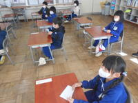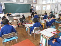 5年生は、算数の授業でした。 円と正多角形を組み合わせた発展問題に取り組んでいました。計算の仕方を工夫して答えを求め、友達と確かめ合っていました。6年生は、外国語の時間でした。大内中や真岡中の先輩が作った英語でのメッセージ動画を視聴していました。