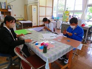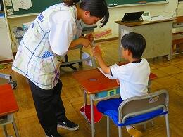写真は、保健室でお手伝いをしている様子です。休み時間など、児童たちとも触れ合ってくれました。