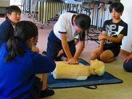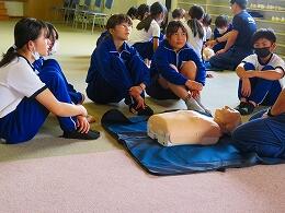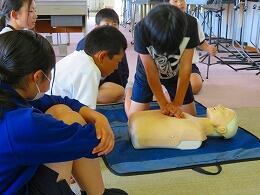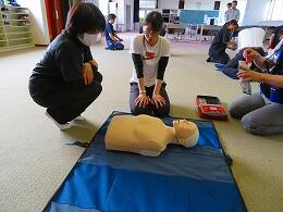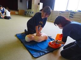 どのような場面の時に胸骨圧迫をするのか、また、模型を使ってどのように胸骨圧迫を行うのか体験をしました。
