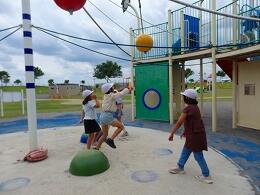 真夏のような青空の下、元気に遊ぶ子供たちがいました。