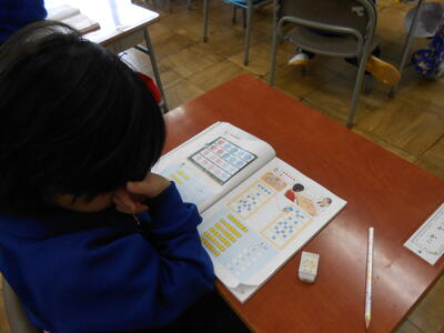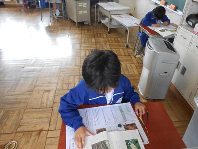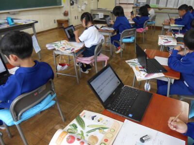 学校に残り組も頑張って学習しています。2年生は、野菜の育て方や収穫時期をインターネットを活用して調べていました。1年生は、算数の学習で、5までの数でした。