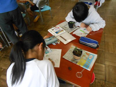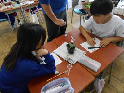 4年生は、理科のヘチマとヒョウタンの苗の観察をしていました。触ったり、においを嗅いだり、五感を使って観察し、記録していました。