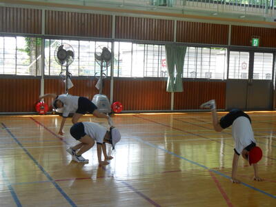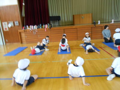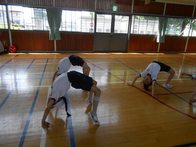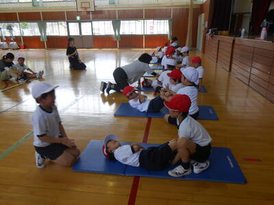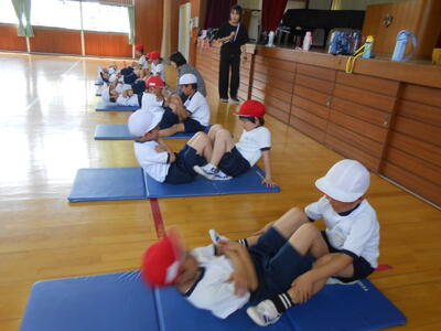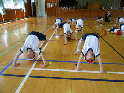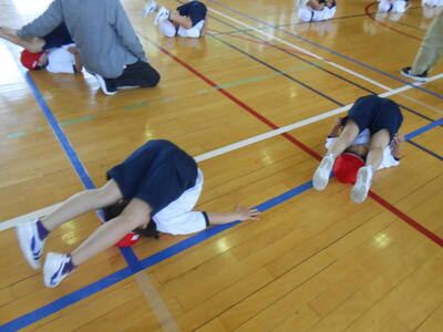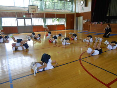 体育は、合同で「多様な動きをつくり運動あそび」をしていました。体が柔らかい子が多くびっくりしました。体力テストに向けて、上体起こしの練習もしていました。2年生のお手本はさすがです。