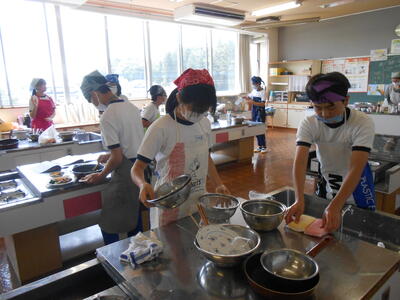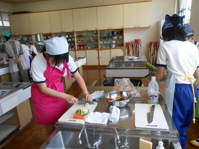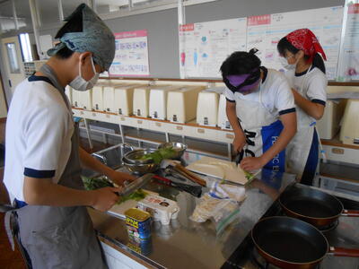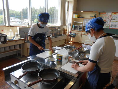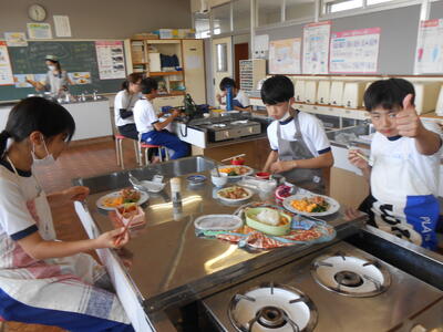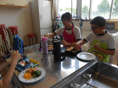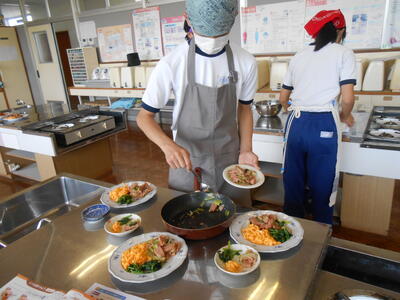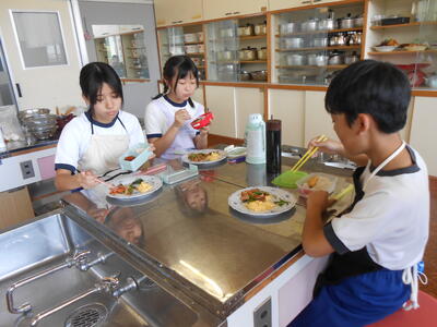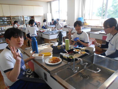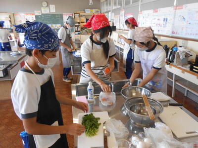 今日は、お弁当の日ですが、家庭科で調理実習行い、それをおかずにしていました。卵料理と青菜の炒め物を作りました。みんな美味しそうに試食していました。