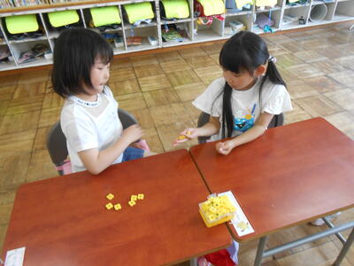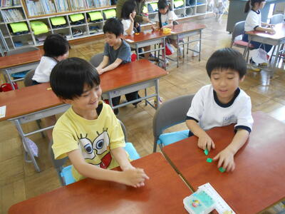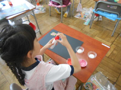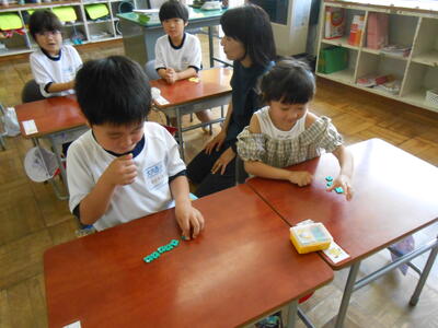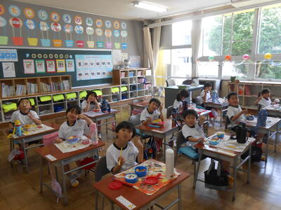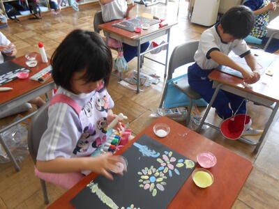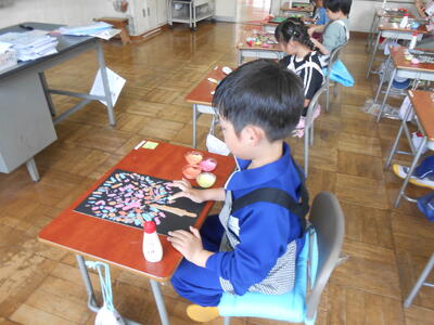 1年生は、算数で6の数の構成の学習をペアでしていました。手の中に、隠し持ったおはじきの数をあてる活動でした。2年生は、絵の具を指を使って描くペイントを行っていました。黒い台紙にカラフルな色とりどりの模様を描いていました。