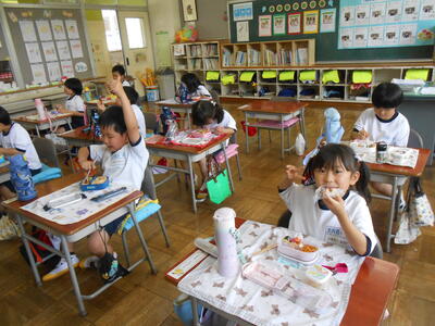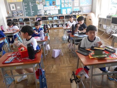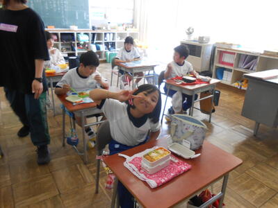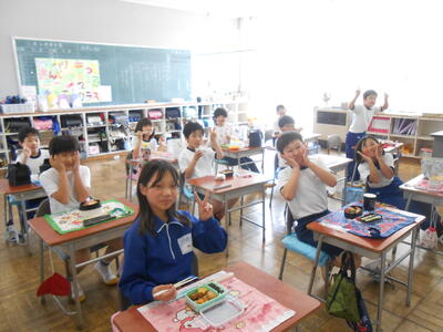 楽しみなお弁当の日。みんなうれしそうに食べていました。教室をのぞくと、「見て、見て。」とお弁当自慢。美味しいポーズもいただきました。みんな感謝をして、残さず食べることでしょう。