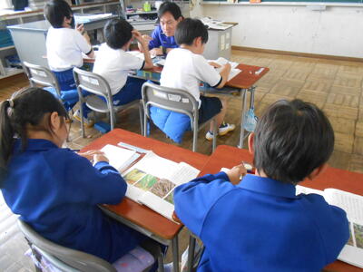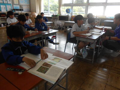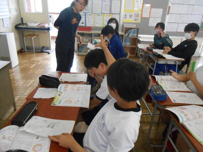 6年生は「イースターの島になぜ森林がないのか」の教材で筆者の問いかけに対しての読み取りをしていました。叙述の表現に注意しながら、原因となる文を探していました。自分の意見を積極的に発言する姿もありました。