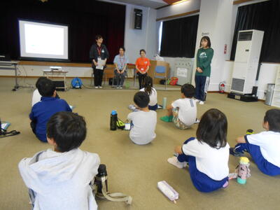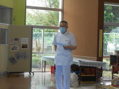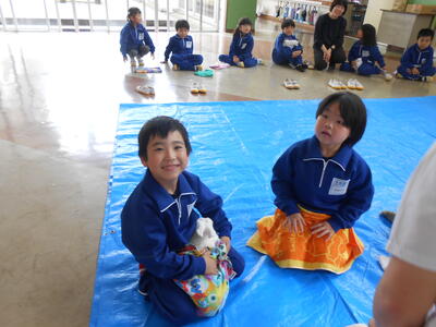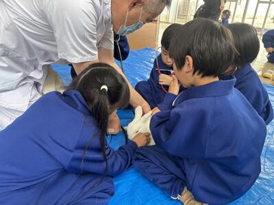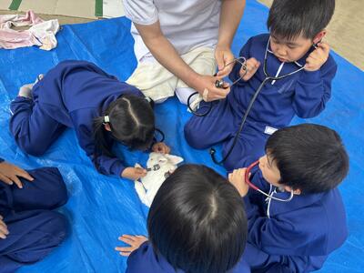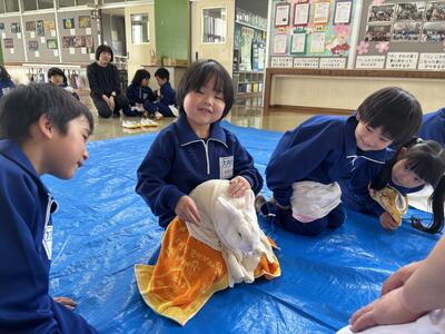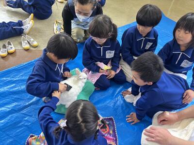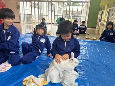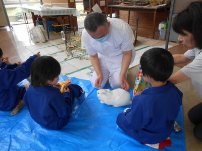 生活科で、小動物とふれあい学習の中で、みんなでお世話をしているウサギとのふれあいの仕方を学習しました。地域の獣医さんにボランティアで来ていただいて、ご指導いただきました。ウサギの心臓の音も聞くことができ、人間との違いを感じた子もいました。