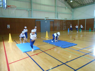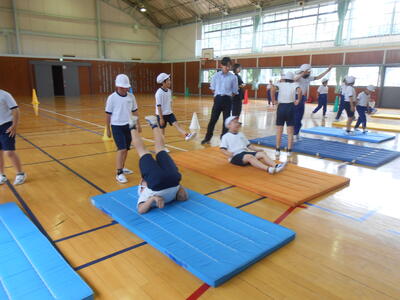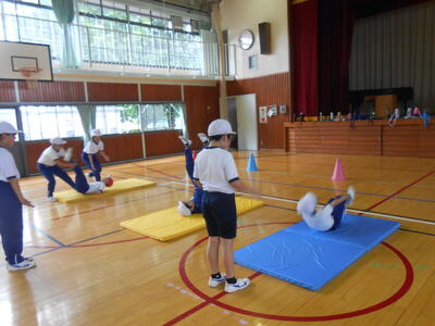 今日の体育は、マット運動につながる動きを取り入れたトレーニングをした後、前転の映像を見て確認をしました。一つ一つの動きに気を付け、うまく回れるこつをつかんでいました。