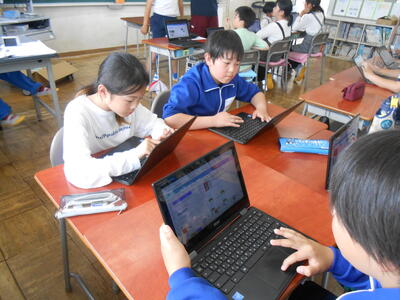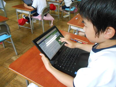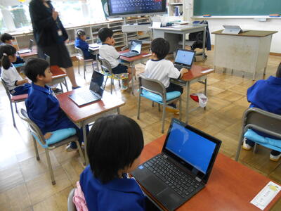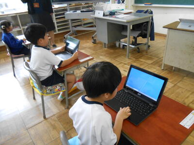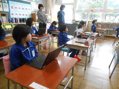 1年生はICT支援員さんに指導してもらいながら、初めてのタブレット学習を行いました。自分のパスワードを入力し立ち上げるところから行いました。2年生は、算数の長さの学習をしていました。ものさしで直線を測ったり、長さの違いを計算で求めたりしていました。