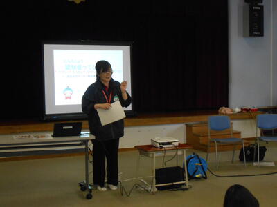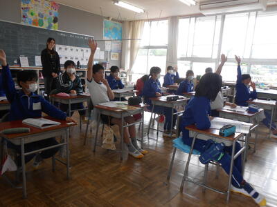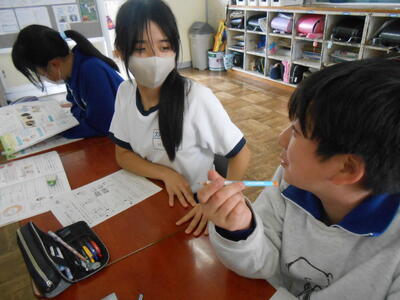 総合的な学習の時間の「福祉」の学習では、市役所の方やボランティアの方に来ていただき、認知症サポートについて学習しました。認知症やそのサポートについての話を聞き、模擬体験や認知症予防体操などもしました。