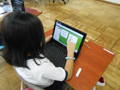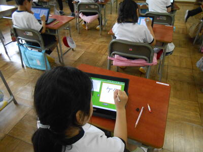 国語の漢字の学習をタブレットのドリルパークで行っていました。正しい筆順が示されたり、線からはみ出すと丸がもらえなかったりと、効果的に活用できます。