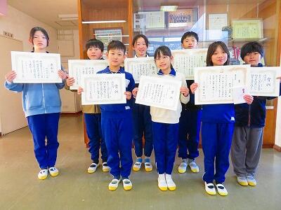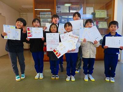 交通安全作文標語コンクール、書初展、下野教育美術展、ノートコンクール、しおりコンテスト、読書賞、多読賞、健康優良児童の表彰を行いました。