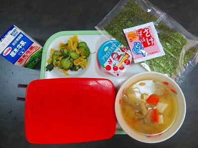 献立は「ごはん、さけぱっぱ、たくわんあえ、こしね汁、おにぎり用のり、ミニアセロラゼリー、牛乳」でした。