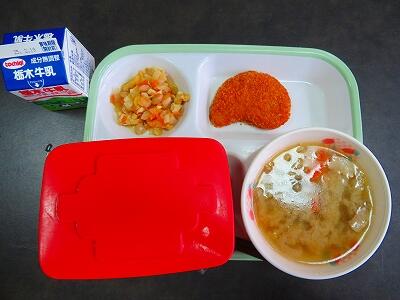 給食のメニューは、ごはん、牛乳、焼きチキンカツ・ソース、しもつかれ、巻き刈り汁でした。