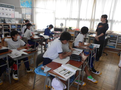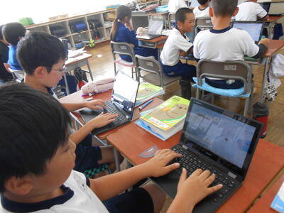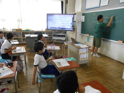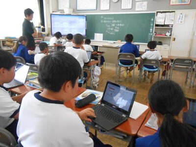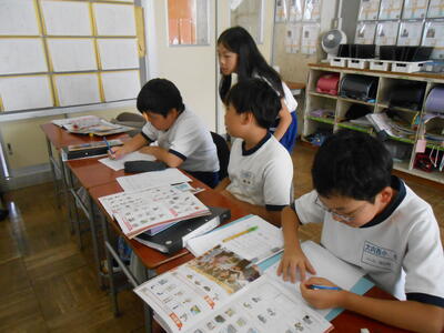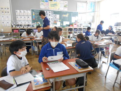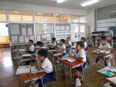 5年生は外国語の授業でした。英語のフレーズを4文作成し、友達とのやりとりのために、発音の練習をしていました。6年生は、算数の授業で、2つの円を組み合わせた円の図形の面積の求め方を考えていました。