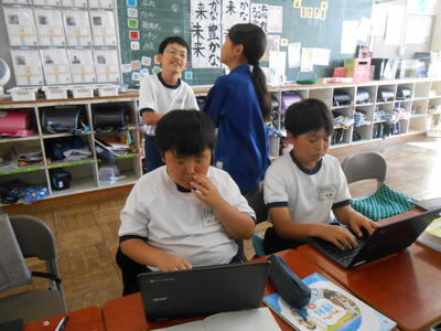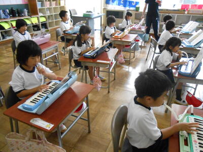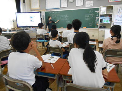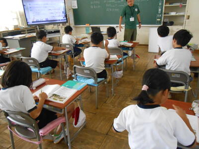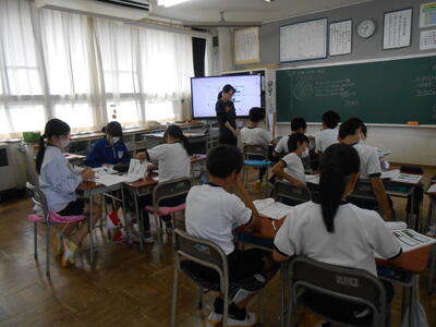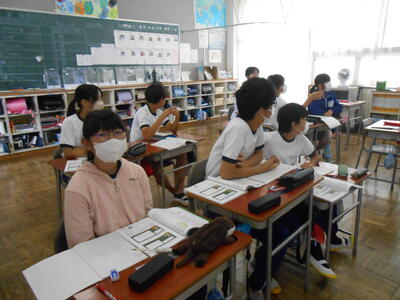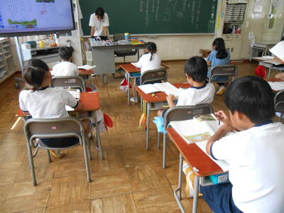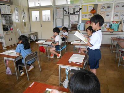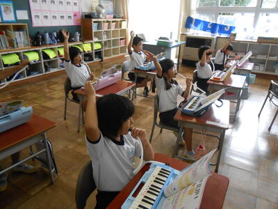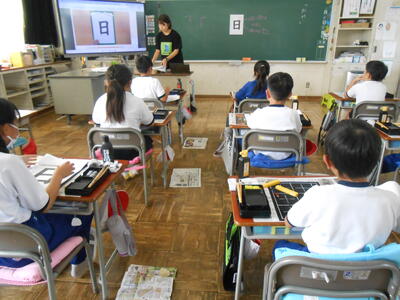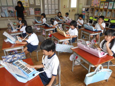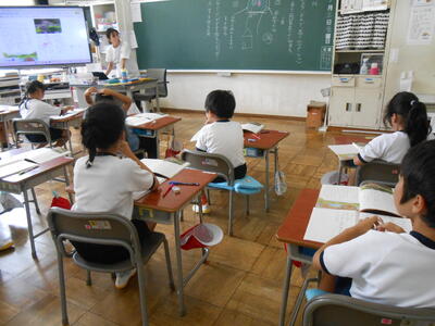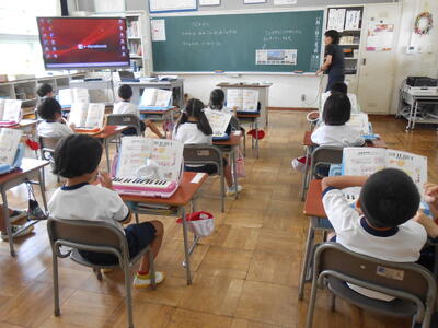 1年生は、音楽で鍵盤ハーモニカを曲に合わせて演奏していました。音階の呼び方を確かめていました。2年生は、国語で「ビーバーの大工事」の授業でした。ビーバーがつくる「巣」の材料について読み取っていました。