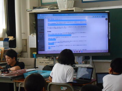 5年生は、理科の授業で生命の誕生の学習を指定し又。メダカと人との違いを考え、タブレットでまとめ、AIにみんなの意見を集約させていました。
