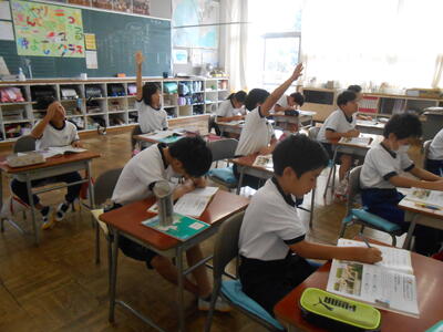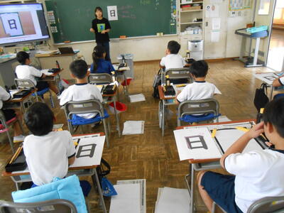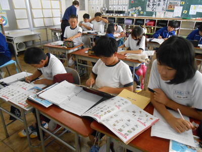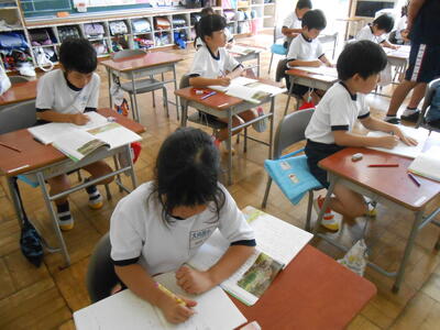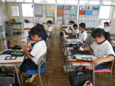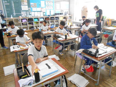 3年生は、書写の毛筆の練習時間でした。「日」という字をおれに気を付けて書いていました。4年生は、理科の授業で、空気でっぽうを使って学習した空気の性質をまとめていました。