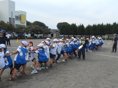 今日の練習は、「全校リレー」と「綱引き」でした。全校リレーは、並ぶ順番や、バトンパスの相手もしっかり覚えていました。はじめての綱引き練習では、5、6年生が後から走ってお助けするやり方です。力強いせめぎあいでした。