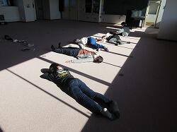 先生は劇団の俳優さんたちです。まずはウォーミングアップです。周りと距離を取りながら歩いたり、言われた人数のグループを作ったり、2人で眼鏡を作ったり、柔軟運動みたいな運動をしたり、言われるがままに何か意味があるのだろうとやっていましたが、やっぱりただのウォーミングアップだったようです。3つのグループに分かれて本格的練習が始まりました。