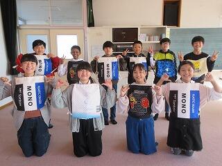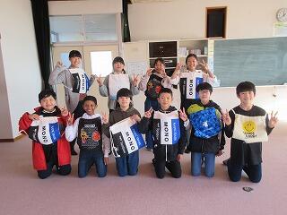 これはいったい何の写真かといいますと、6年生が初めてリニューアルした音楽室に入った時の様子です。「今までの敷物よりふかふか」という感想が上がっていたそうです。新しいところで、家庭科のナップザック完成の記念写真も撮りました。