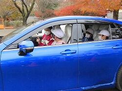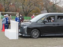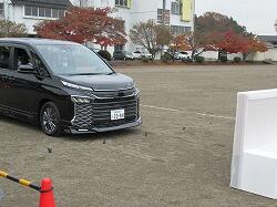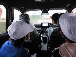 青い車は燃料電池車で、水素と酸素を結び付けて発電し、バッテリーにためて走るそうです、排出するのは水だけなので環境にいいと注目されています。黒い車は前に物があると、車が勝手に止まるという安全装置を体験する車です。グループごとに試乗させてもらっていました。