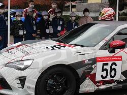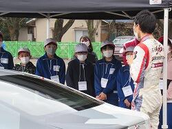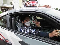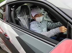 白と灰色の模様付きの車は公道を走れるレーシングカーです。いつのまにか担任も試乗してご満悦です。
