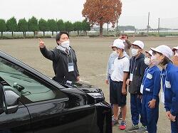29日に5年生がトヨタ自動車が行っている「クルマ未来スクール」を体験しました。トヨタの人がたくさん来て準備してくださいました。展示車も3台です。天気の様子を見て、雨が降らないうちにと体験を前半にしました。