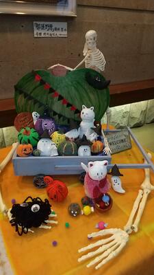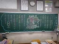 職員玄関の飾りを教育業務支援員さんであり、地域連携コーディネーターである方が、作ってきてくれました。今回の作品は、これまでで最高の出来栄えとの評判です。学校に来た時にご覧ください。