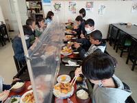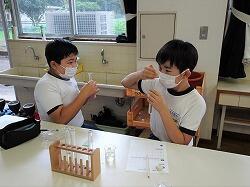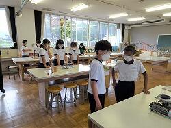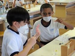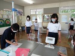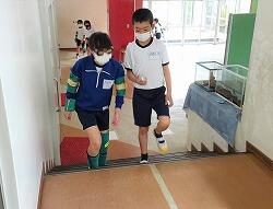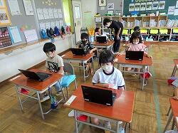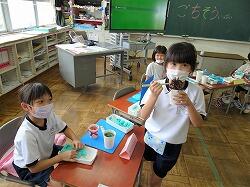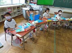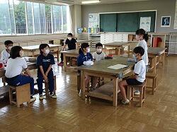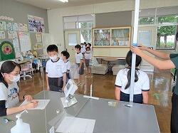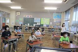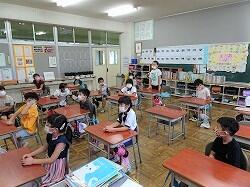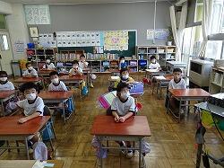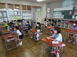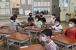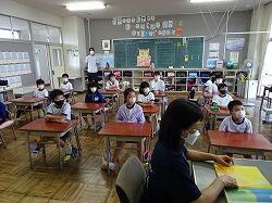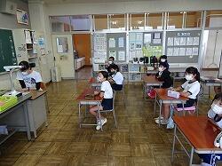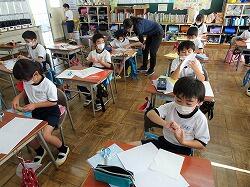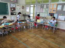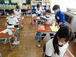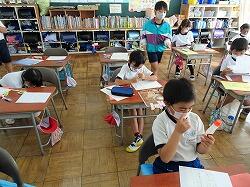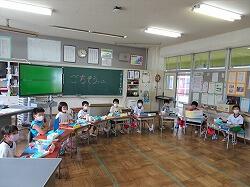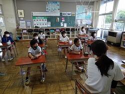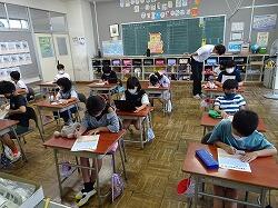 今日も静かに学習していました。1・2年生は、終わった子やわからない子が積極的に手を挙げていました。ムシムシしているので水分等は合間に自由にとっています。休憩時間は友達と楽しそうに話したり、ウサギなど生き物の様子を見たりしています。