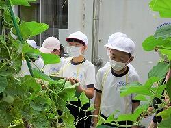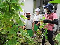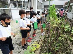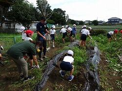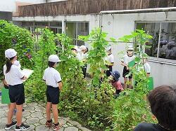 サマースクールが終わり、下校時には、学年の農園の様子も見に行って、収穫していました。今年は世話がよかったせいでたくさん収穫できているようです。ナスやミニトマト・ピーマン・オクラ・枝豆など学年によって種類もたくさんありました。瓜みたいに大きな黄色いキュウリもありましたが、それは捨てました。袋に入れて嬉しそうに持っていきました。