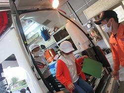 体育館で説明を聞いてから2人1組で交代で後ろについて押しながら体験しました。体育館の入り口のスロープや、外の砂利敷きのところなど車いすで移動しにくいところも試してみました。