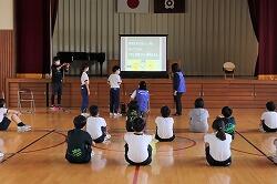 最初は1~3年生が会場の音楽室にいて、4~6年生は教室でオンラインで見ています。児童代表のあいさつのあと始まりです。